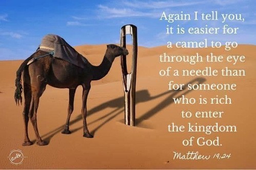 But camels would need to be unloaded to get through this narrow gateway. Jesus could have been making the analogy that a wealthy man would have to empty his material possessions to enter heaven, just like the camel going through the gateway. Either way, Jesus ends with the one thing we must remember - nothing is impossible with God. If you are looking for salvation today, you must let go of whatever you are holding onto and seek first His Kingdom.